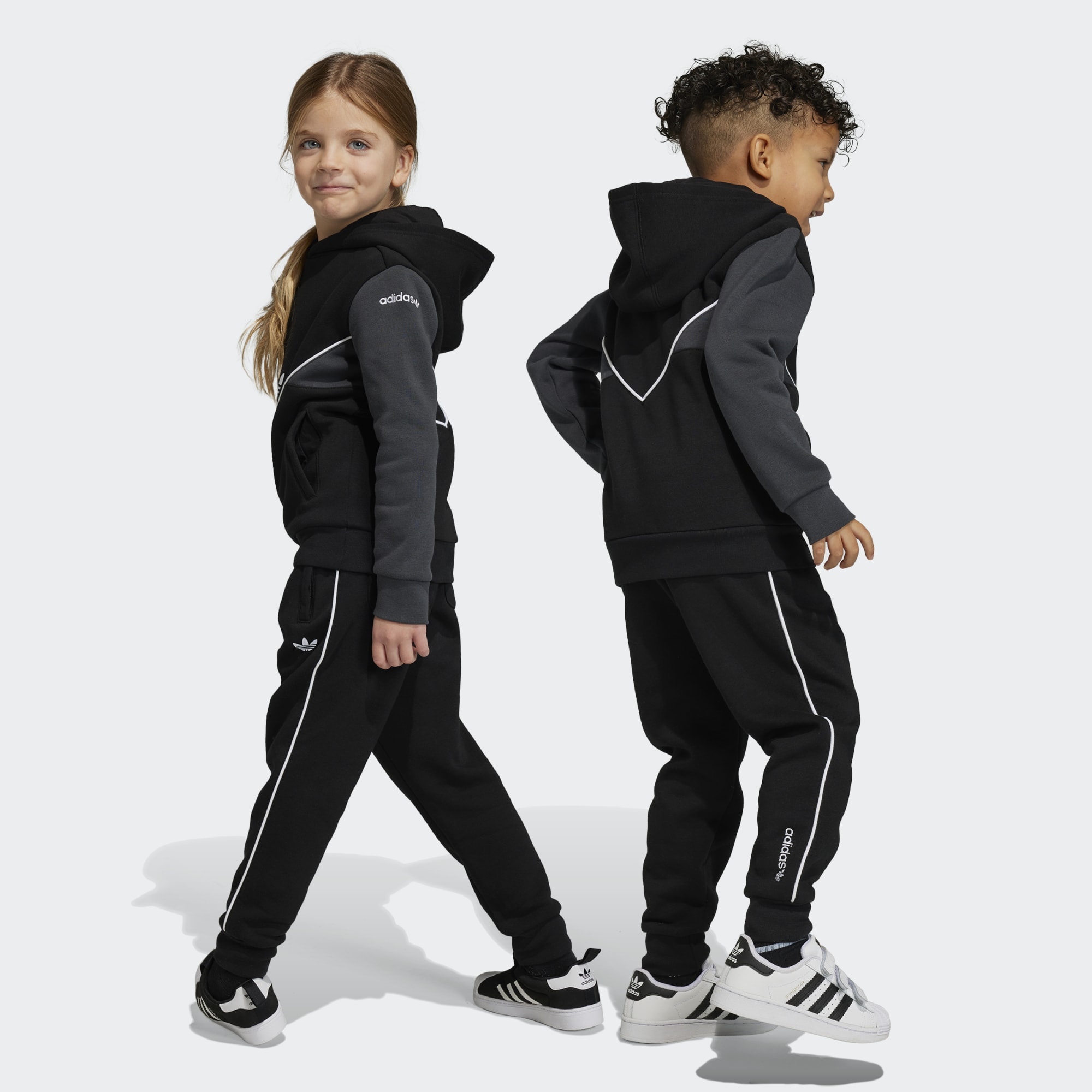 Archival cut lines highlighted with piping details give this kids' adidas hoodie set its effortlessly cool retro style. From lounging around at home to spending time with friends, they'll be comfortable all day long in soft fleece. A Trefoil logo brings it home for a look that is anything but ordinary.