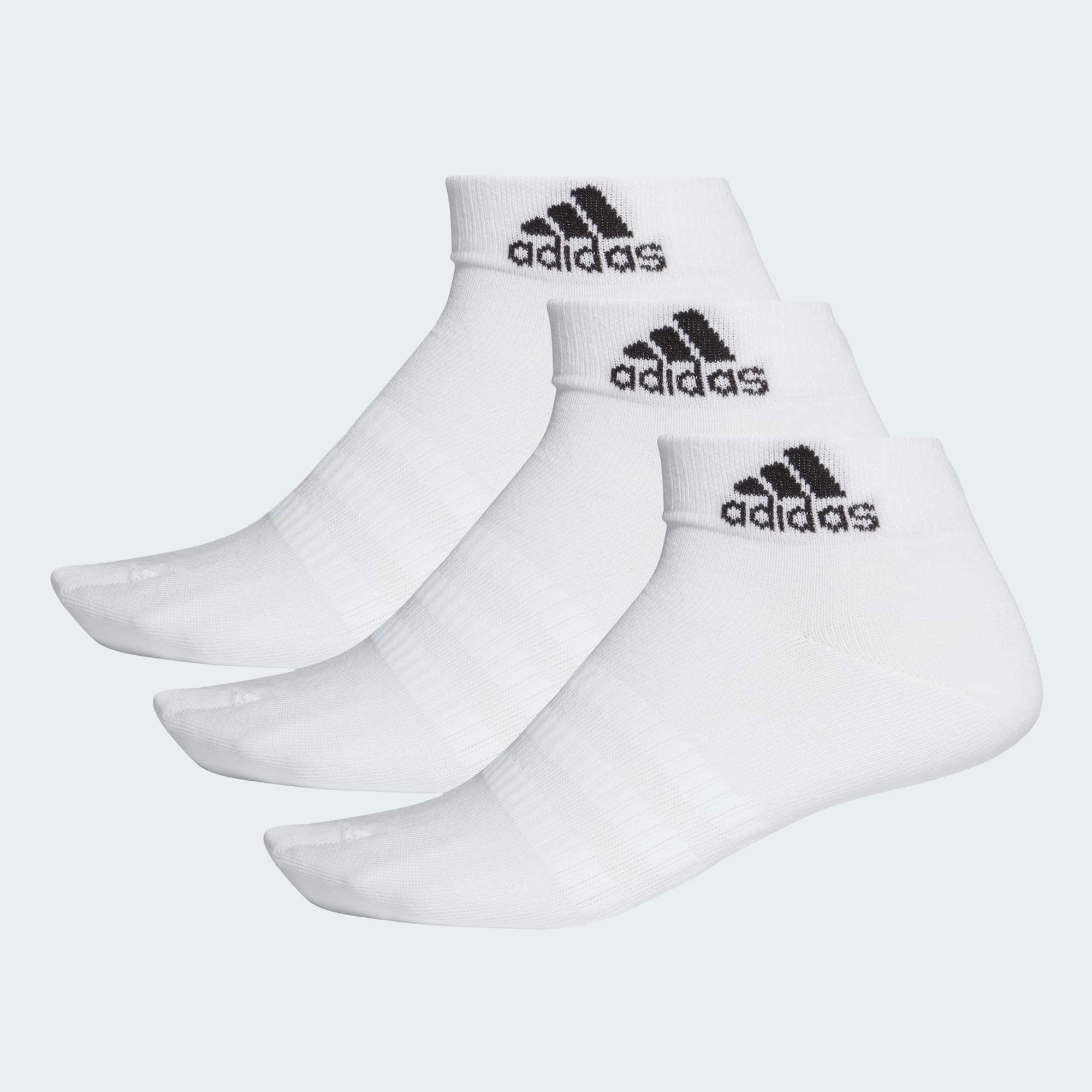 Light, thin and built for comfort, these ankle-length socks come three pairs to a pack. They're made of cotton-rich fabric with knit-in arch support and a smooth toe seam. An adidas logo accents the ribbed cuff for sporty style.