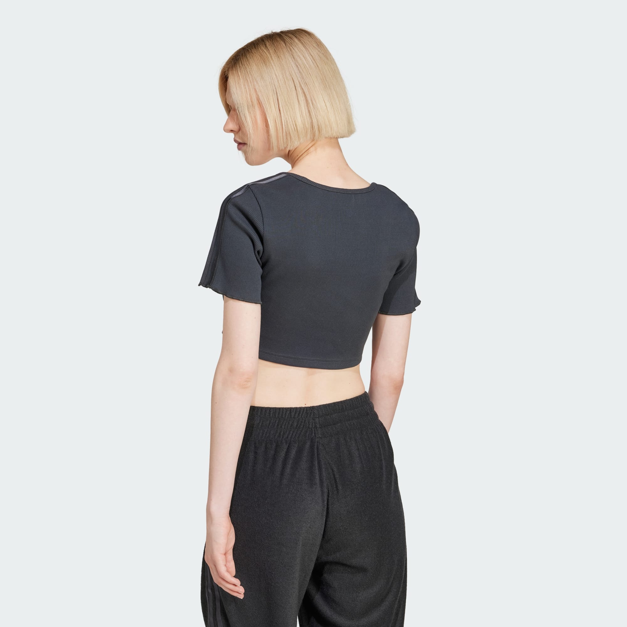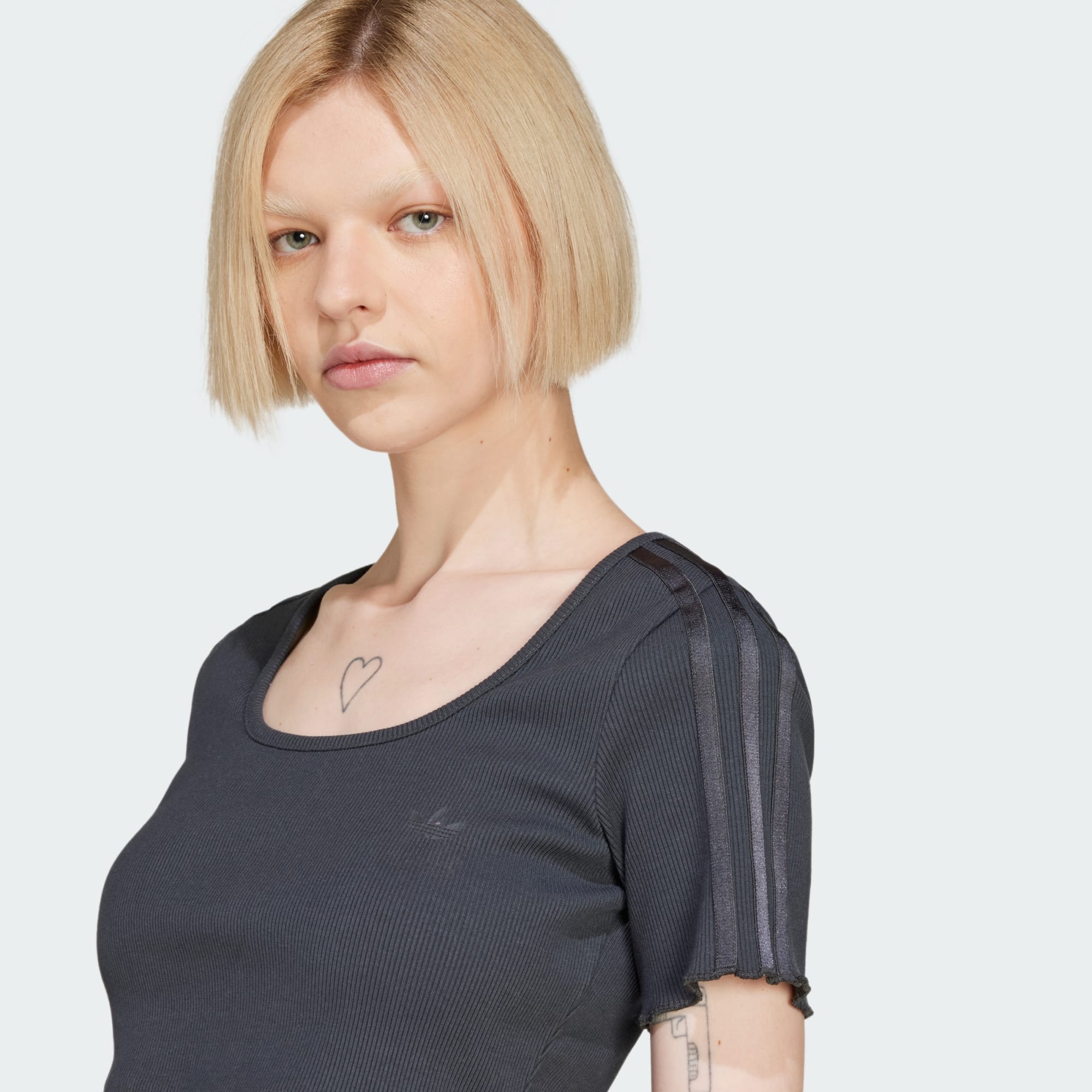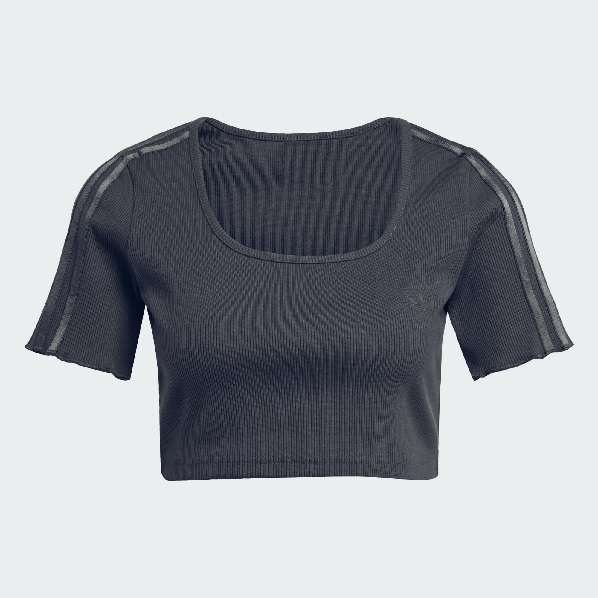 Leaning hard on a '90s aesthetic for inspiration, this adidas baby tee has all food court vibes from the shopping mall glory days. A cropped cut, scoop neck and ruffled sleeves all play into the look. Metallic 3-Stripes catch the light for some added shine.