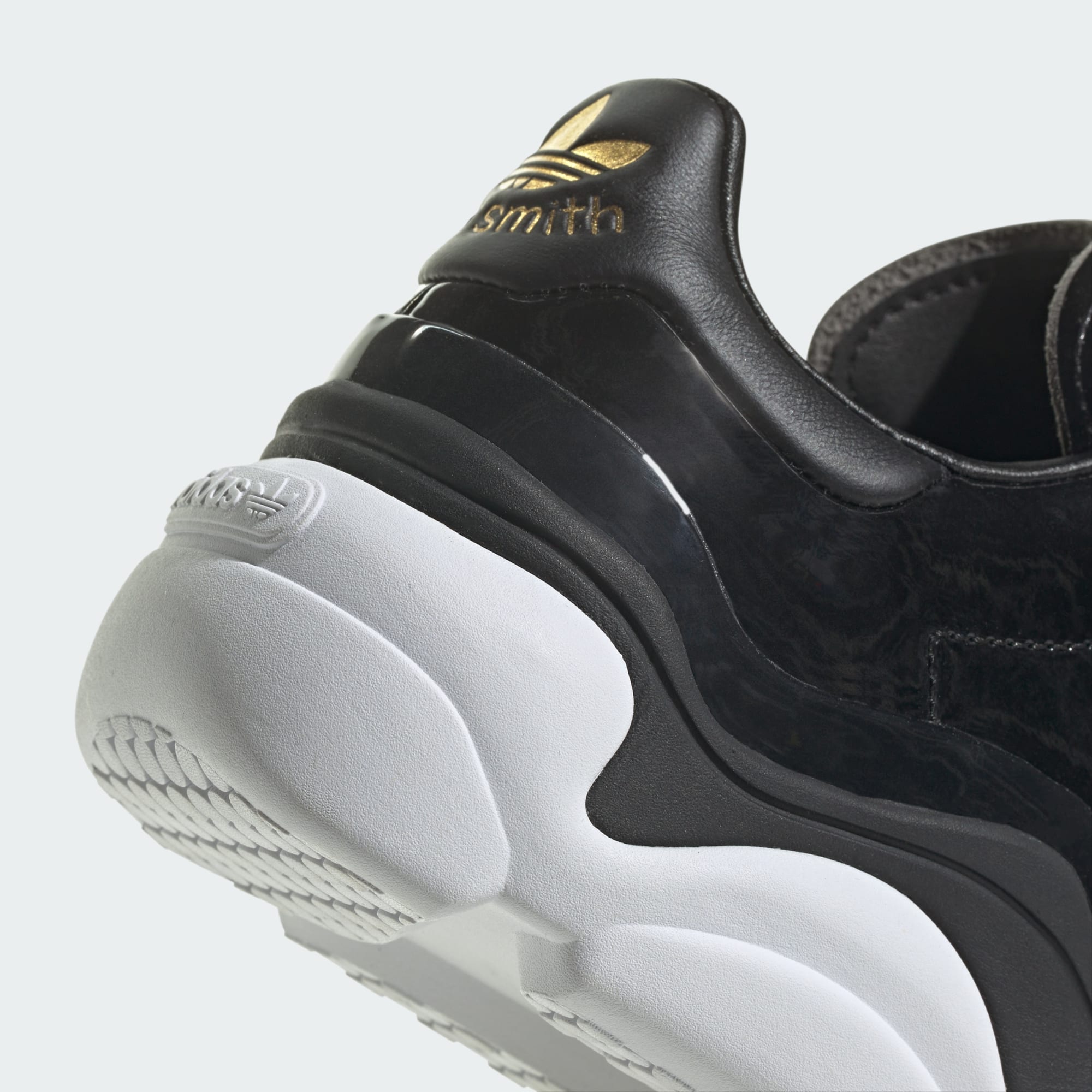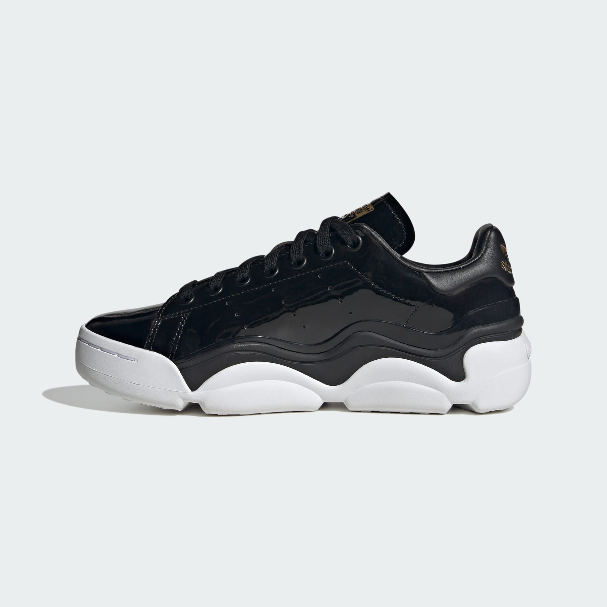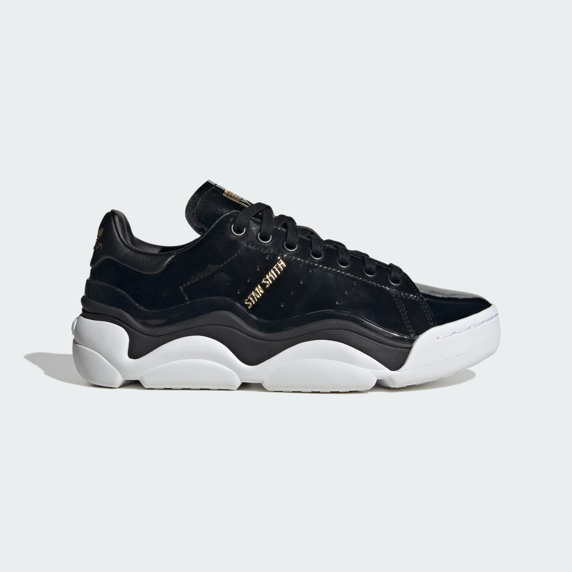 Cultural icons. Reliable companions. To put it simply, adidas Stan Smith Shoes changed the game when they burst onto the scene over 50 years ago. And now this modern version sets a whole new standard when it comes to luxury. A black patent leather upper rides atop a glossy TPU wave for an almost otherworldly appeal. Metallic-gold detailing finishes off the look with a futuristic flourish. Sleek and sophisticated, these trainers have just enough edge to enhance your everyday flow. Made with a series of recycled materials, this upper features at least 50% recycled content. This product represents just one of our solutions to help end plastic waste.