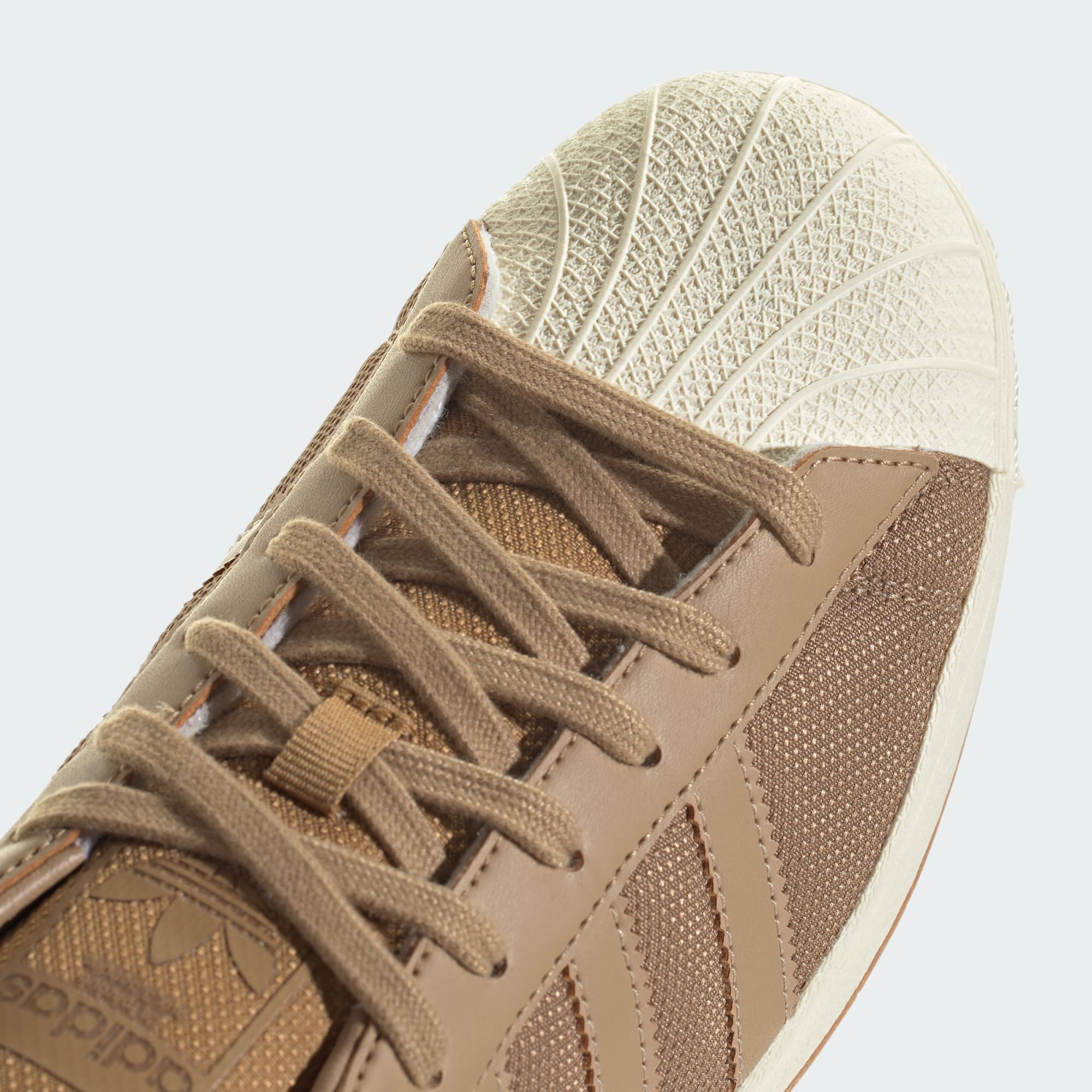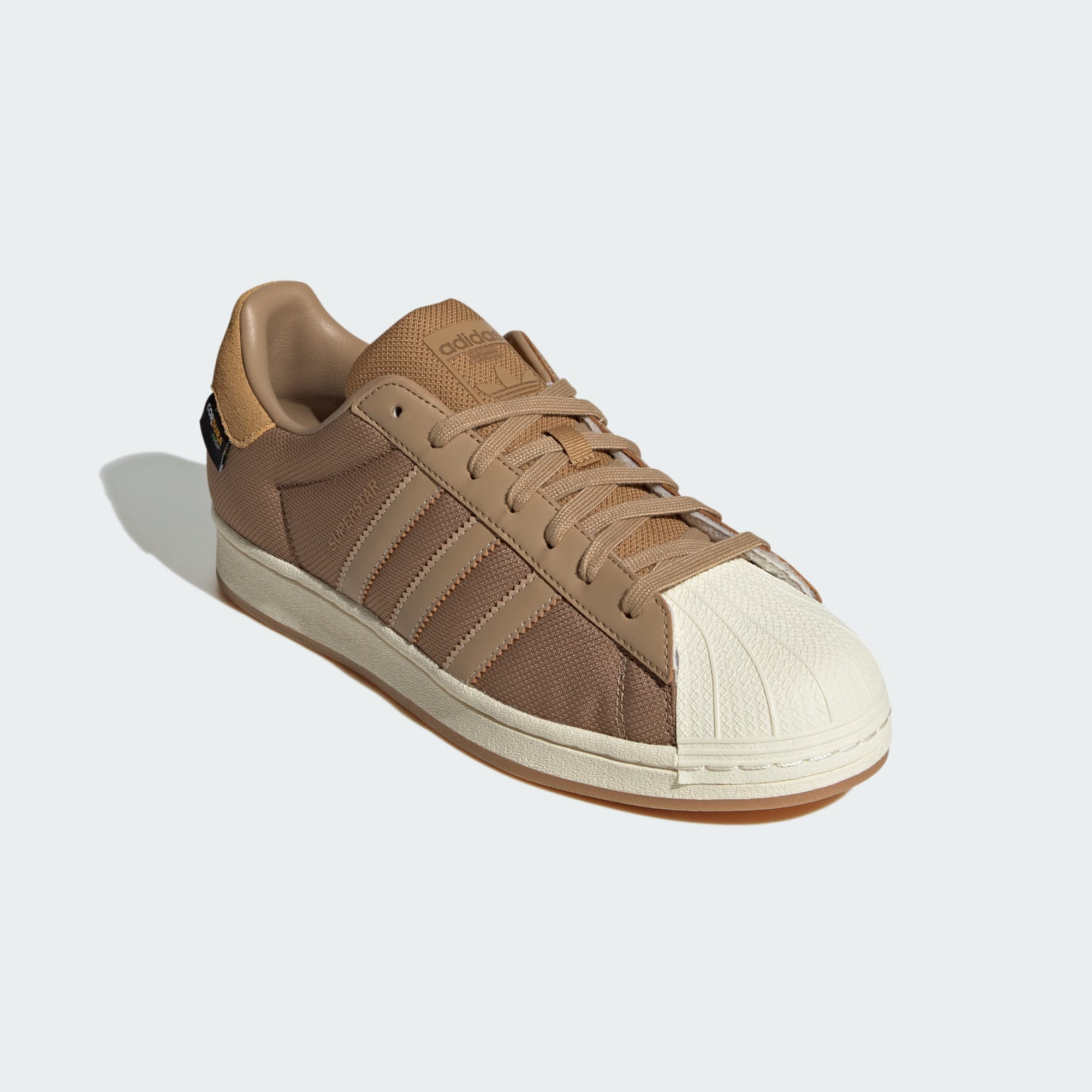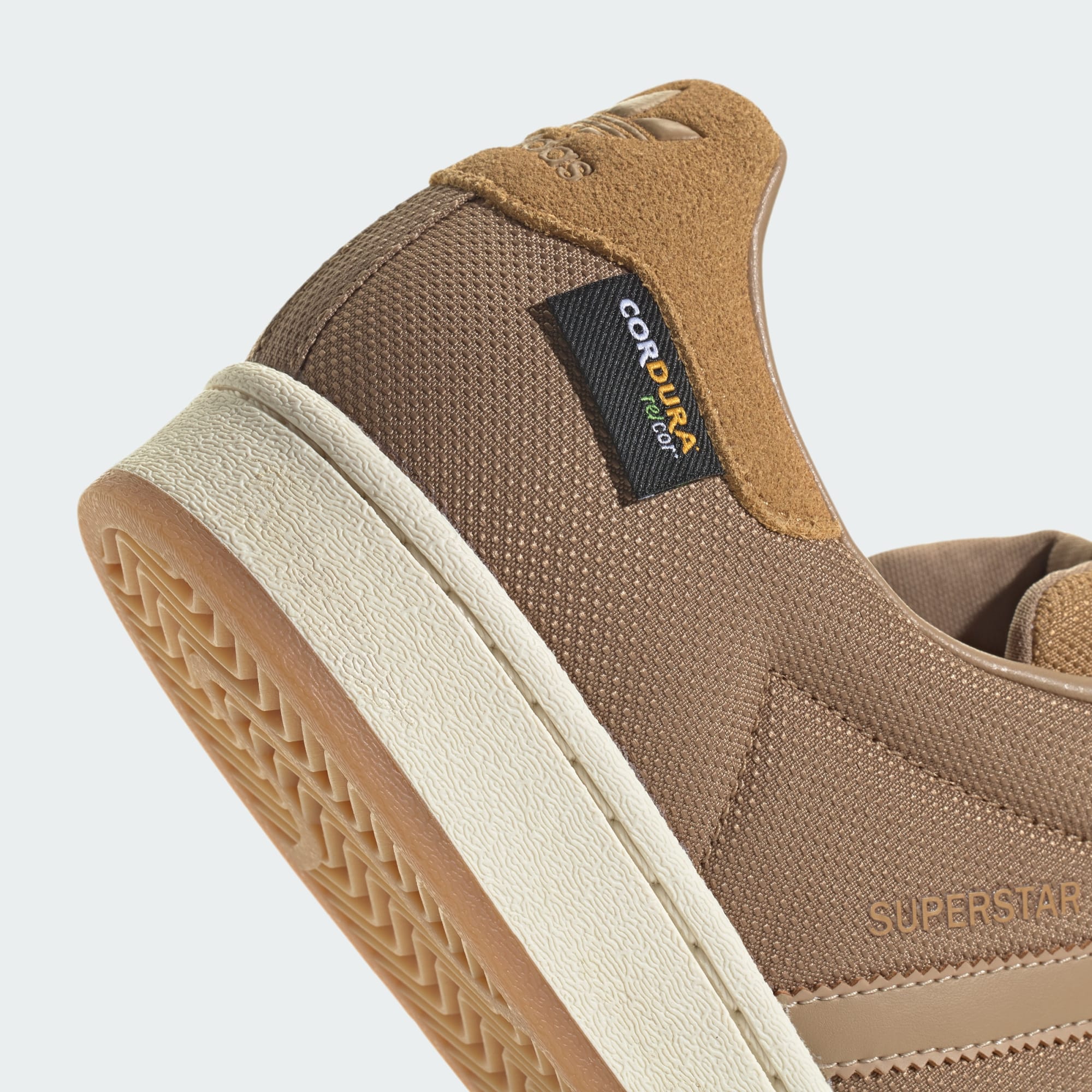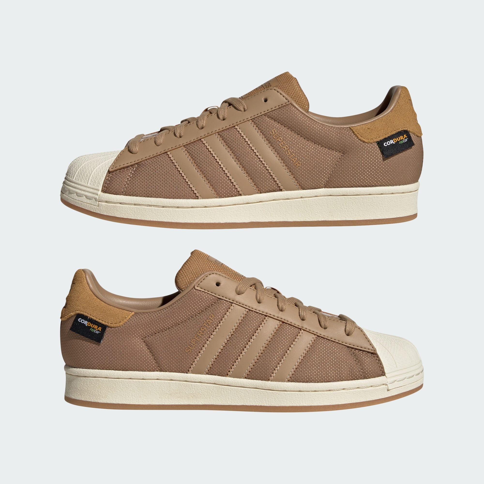 The adidas Superstar shoes have delivered timeless style for over fifty years. From the rubber shell toe to the serrated 3-Stripes, these shoes have remained an icon. This pair shakes up the classic look with a durable CORDURA® upper for an all-seasons energy. Earthy tones and the vintage gum sole bring home the aesthetic. Time to go out and kick up some autumn leaves.