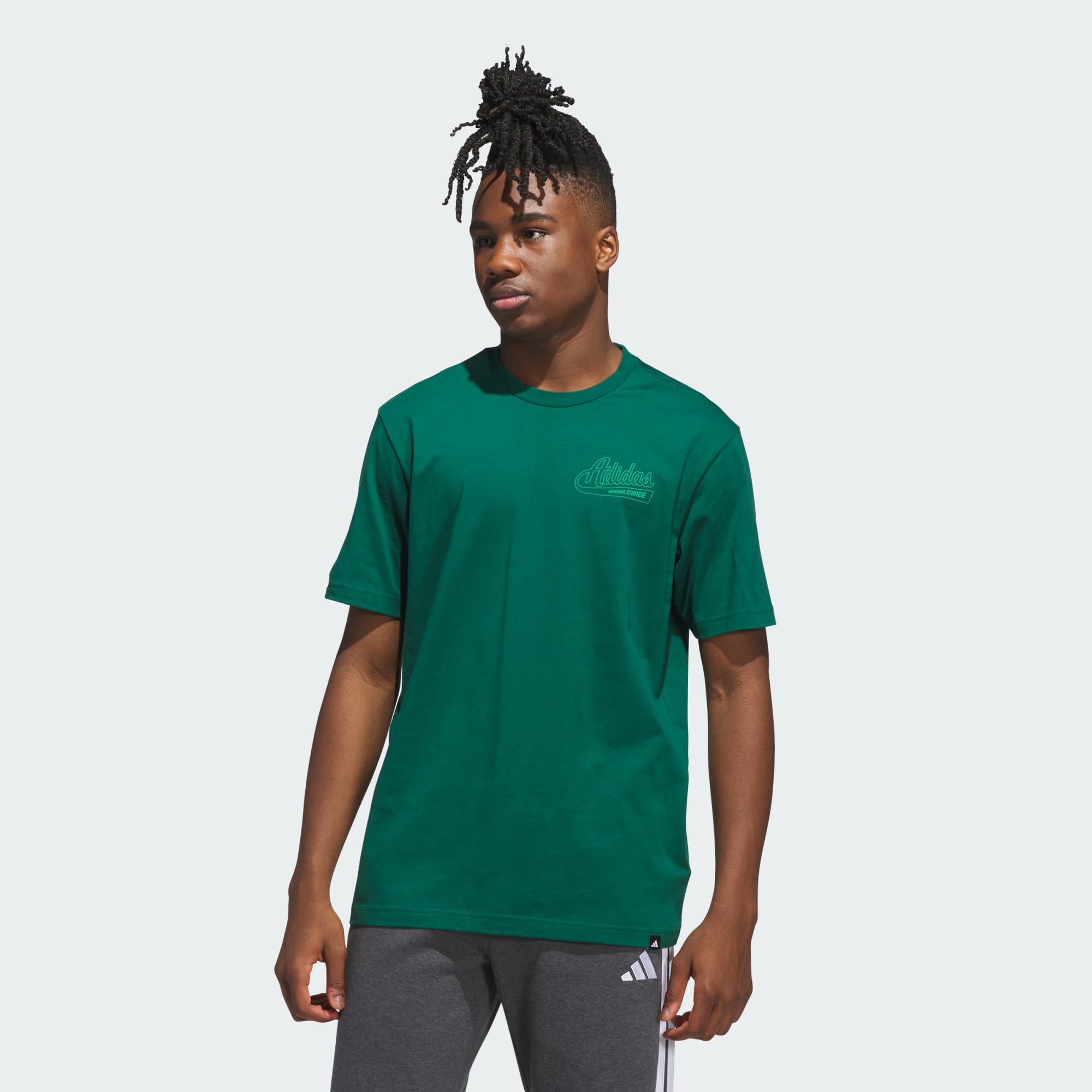 Endlessly versatile, this graphic tee pairs with just about anything in your wardrobe. The soft cotton build and short sleeves make it an easy choice for casual comfort. A bold front graphic inspired by retro team sports shows your love for adidas style.